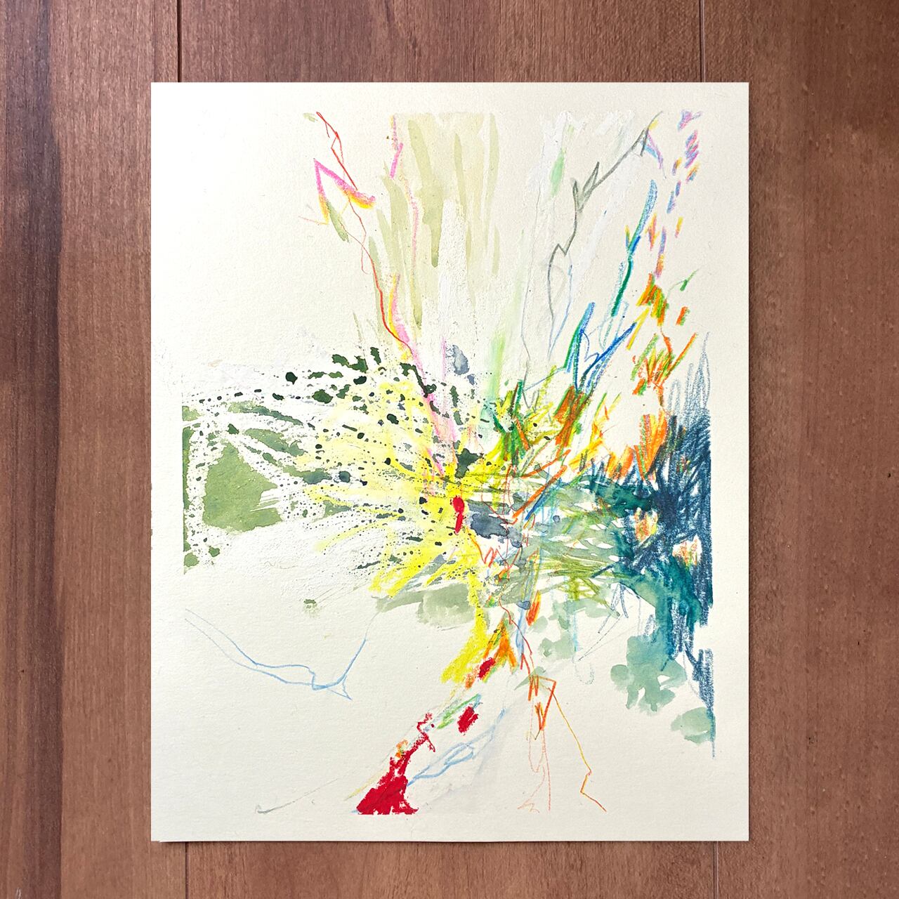 水彩紙に、アクリル絵の具・オイルパステル・水彩色鉛筆で描かれた抽象画「ドローイング19」です。明るい色調とダイナミックなストロークが特徴です。用紙サイズは17cm×22cmです。