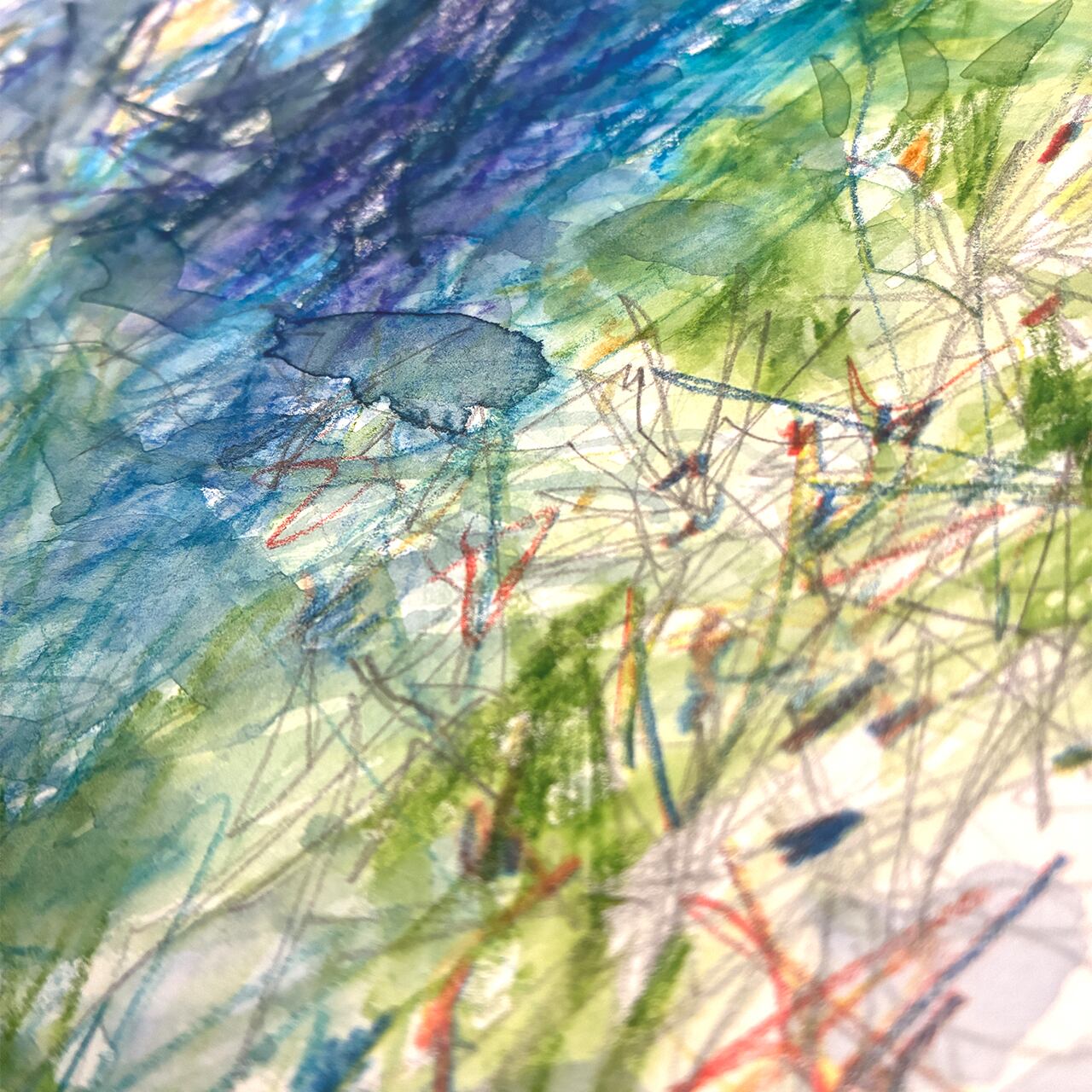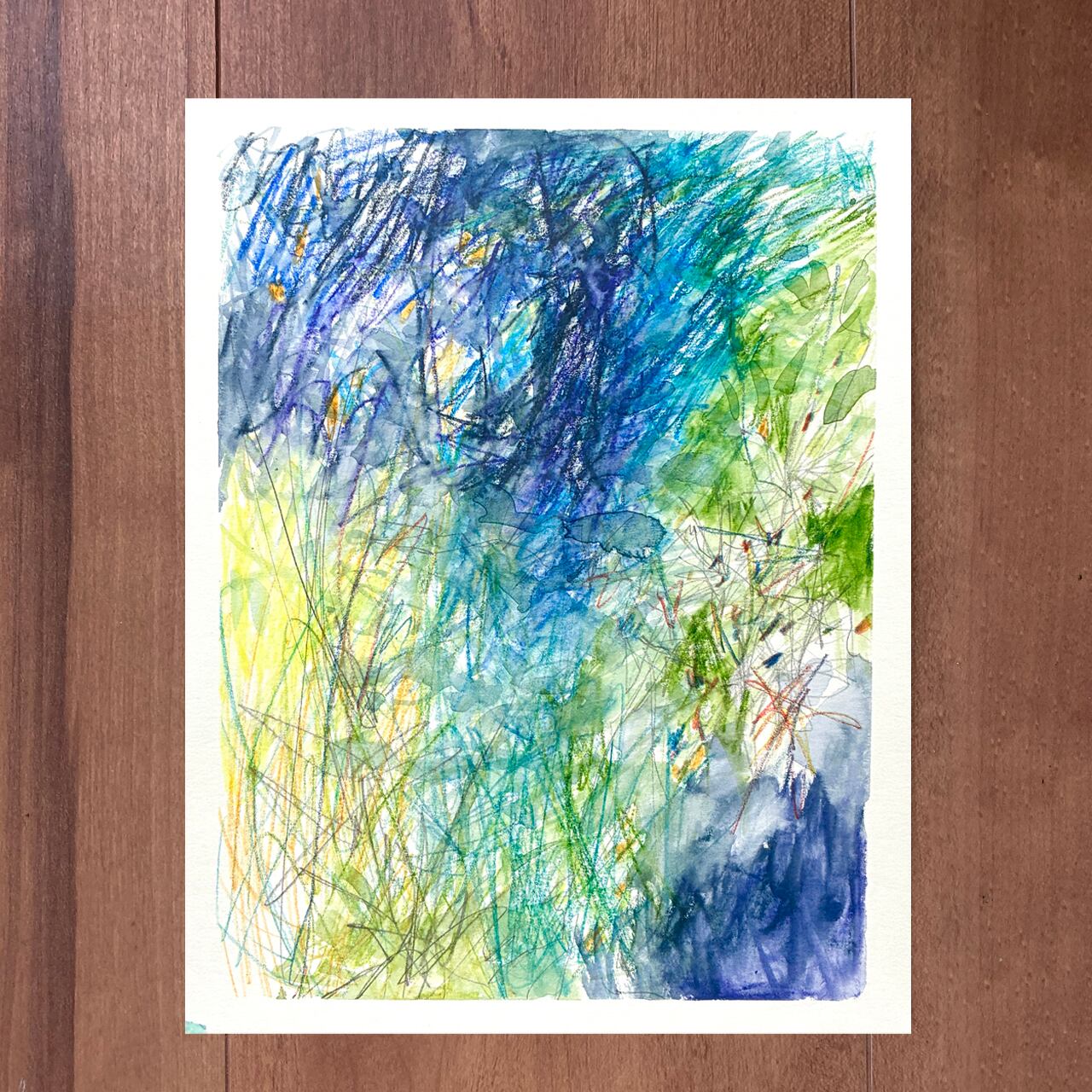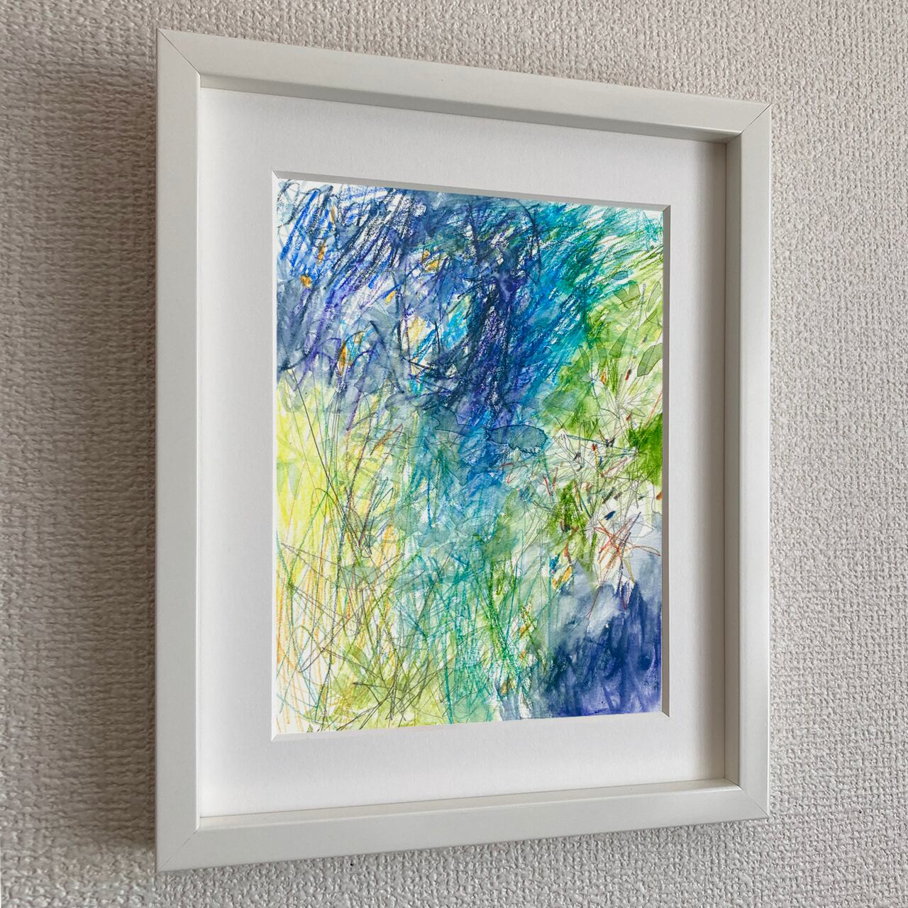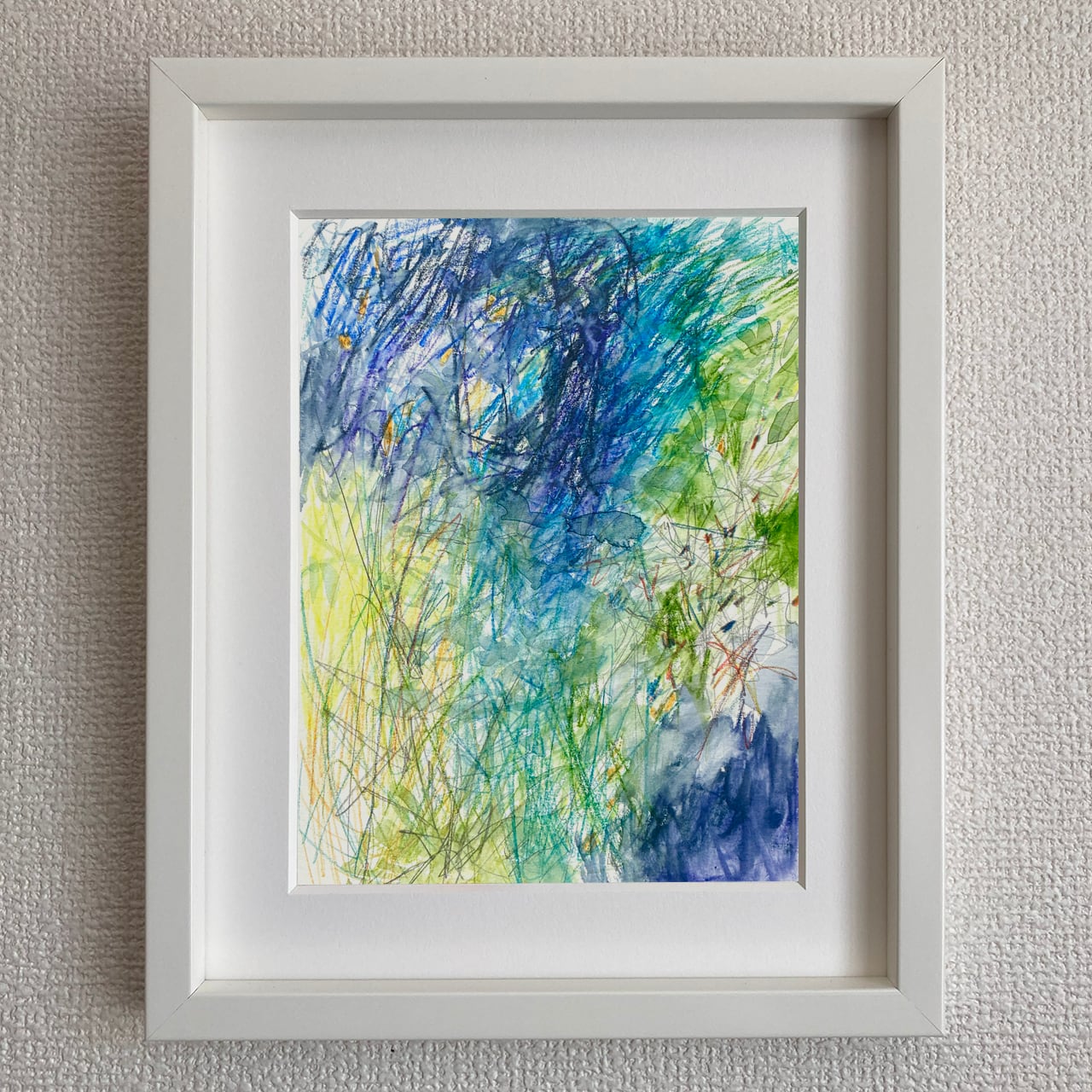 水彩紙に、水彩色鉛筆で描かれた抽象画「ドローイング20」です。明るい色調とダイナミックなストロークが特徴です。用紙サイズは17cm×22cmです。