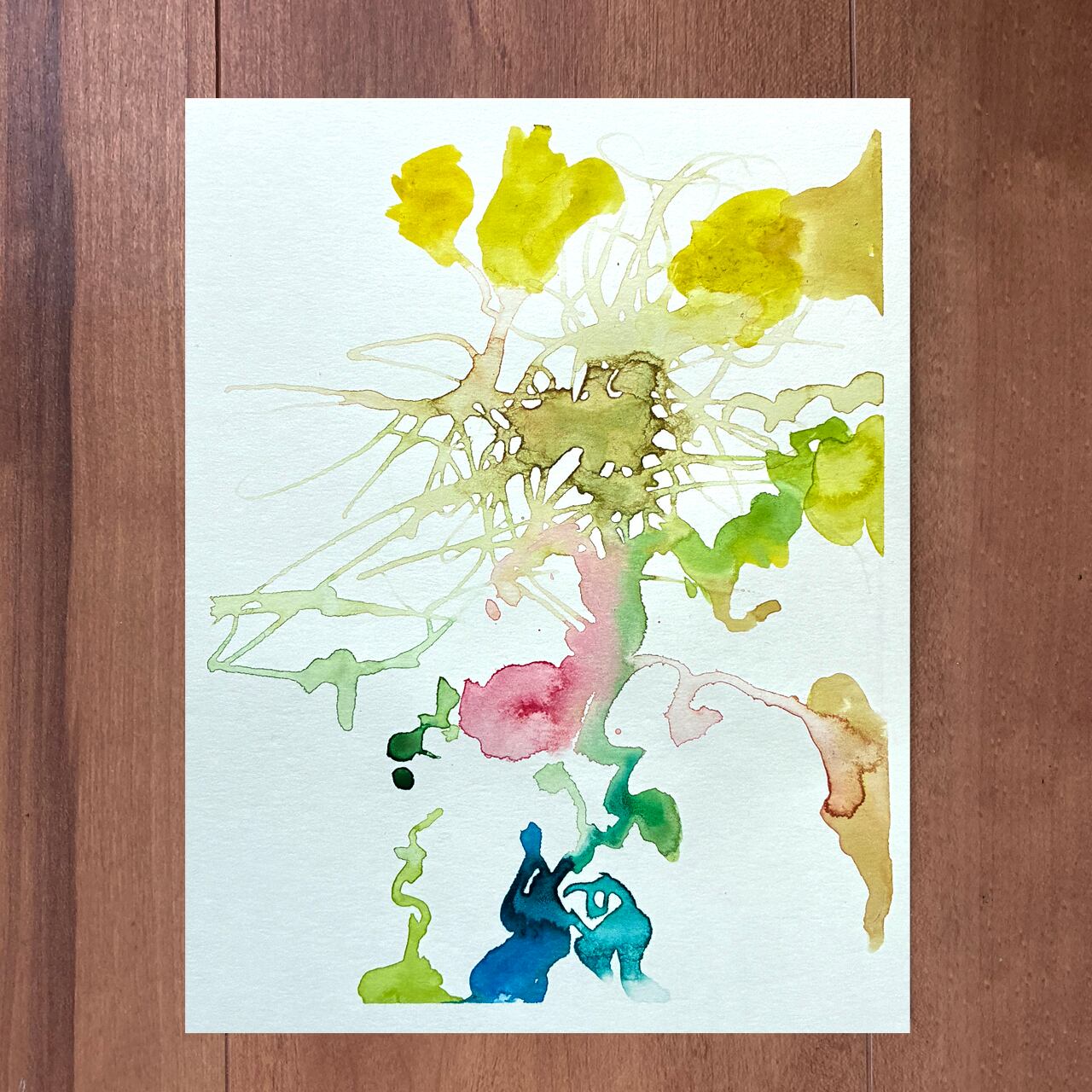水彩紙に、水彩で描かれた抽象画「ドローイング22」です。明るい色調とダイナミックなストロークが特徴です。用紙サイズは17cm×22cmです。