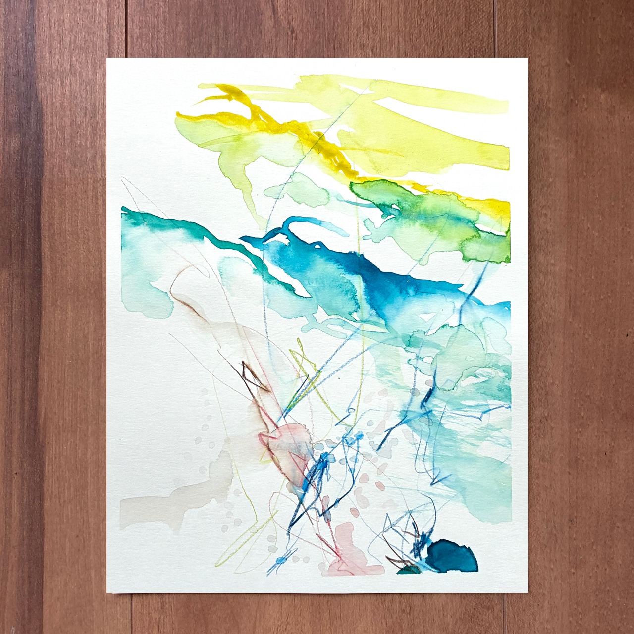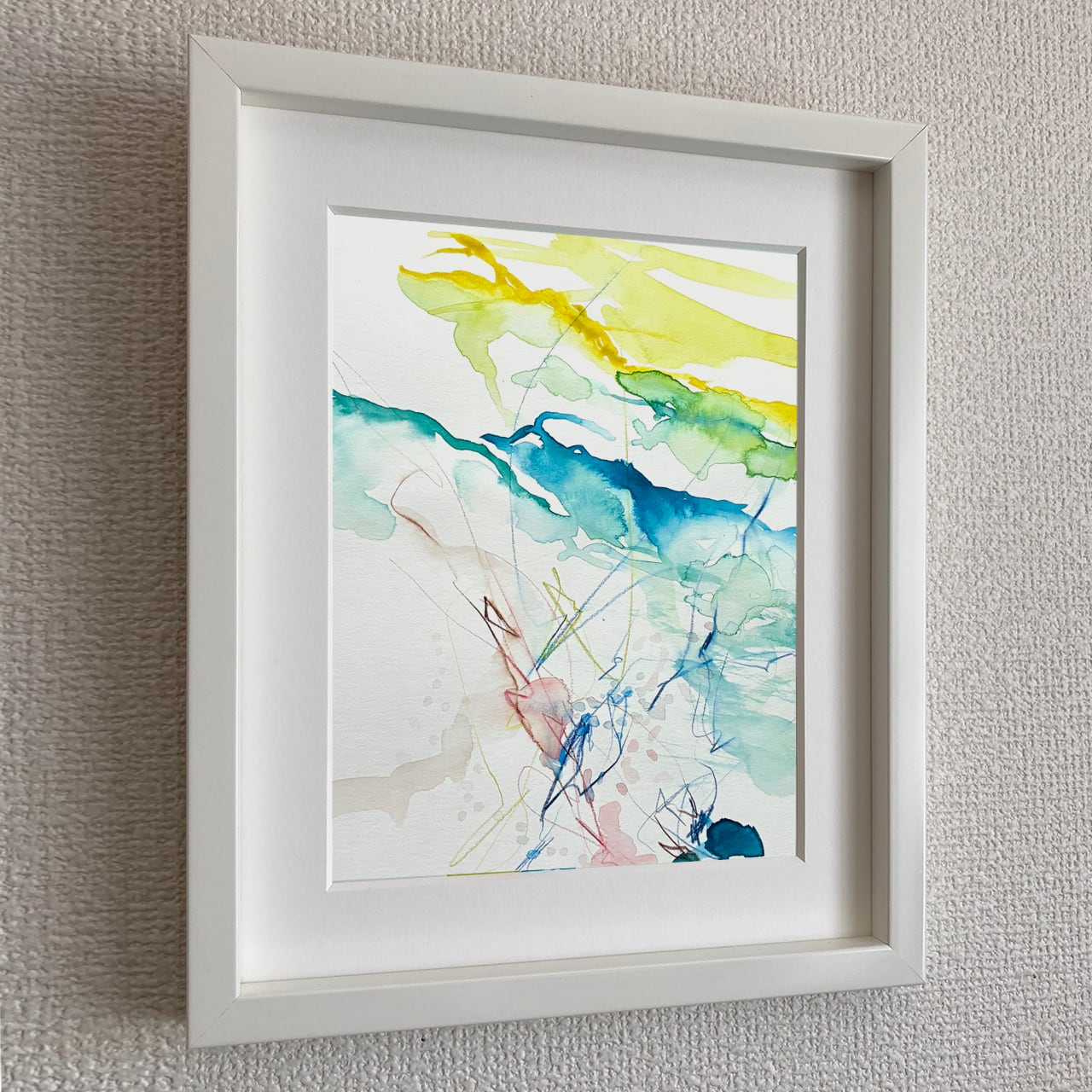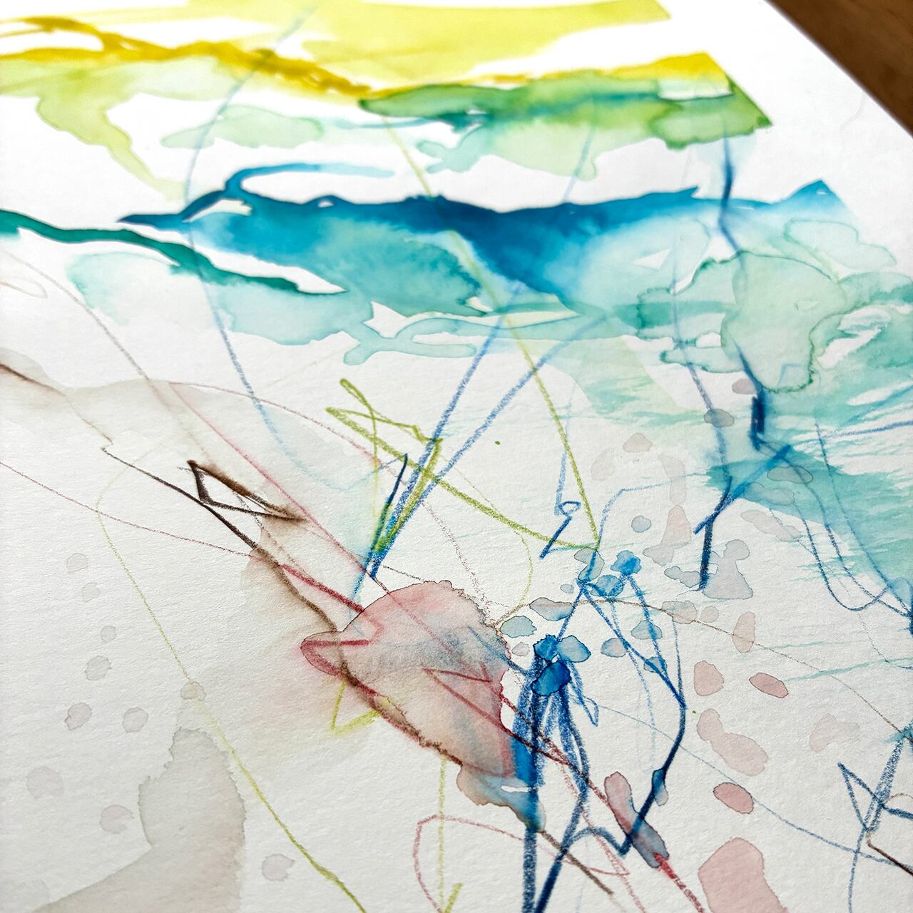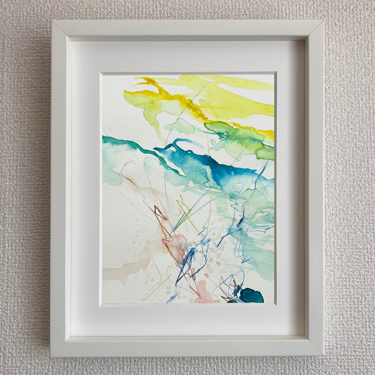水彩紙に、水彩と水彩色鉛筆で描かれた抽象画「ドローイング23」です。明るい色調とダイナミックなストロークが特徴です。用紙サイズは17cm×22cmです。