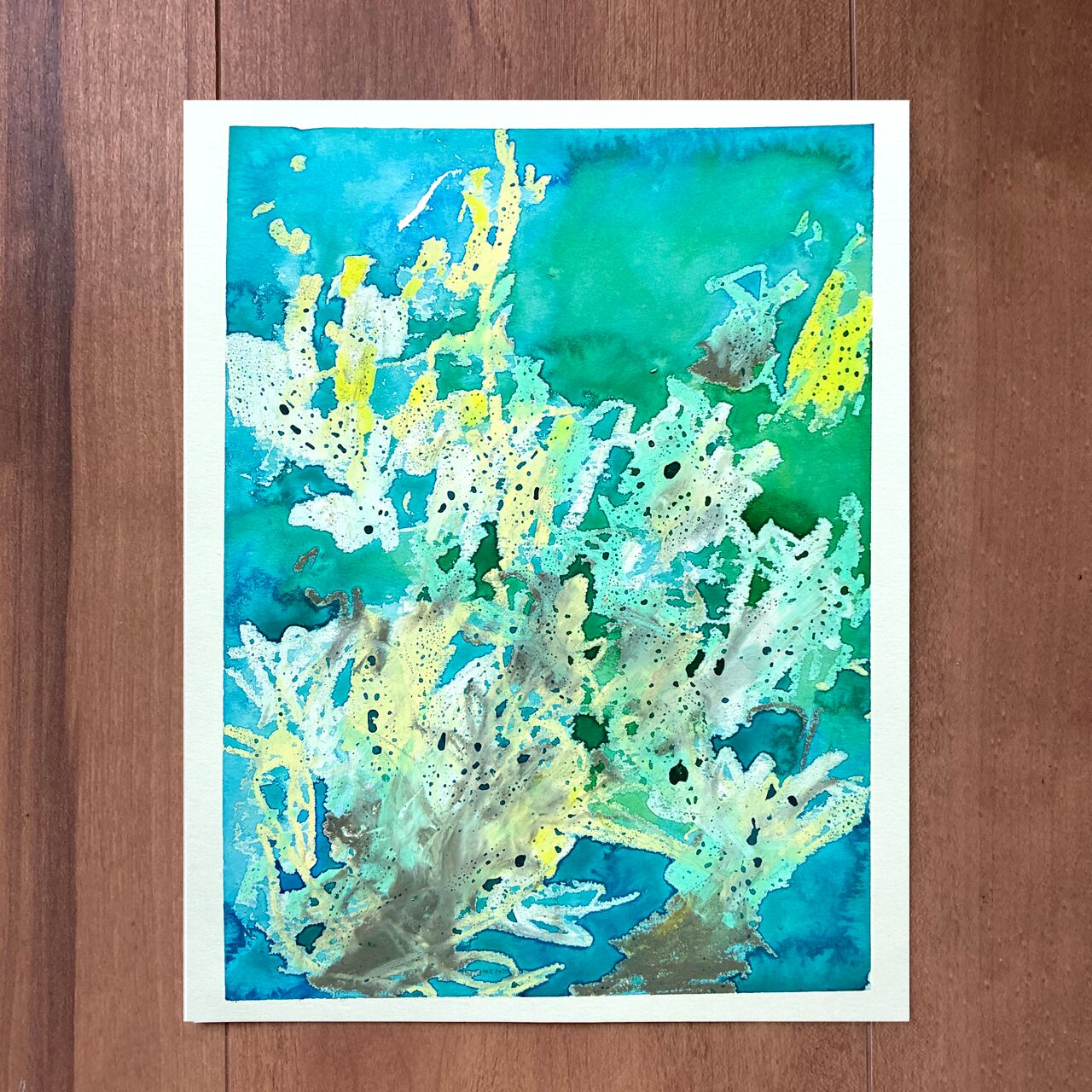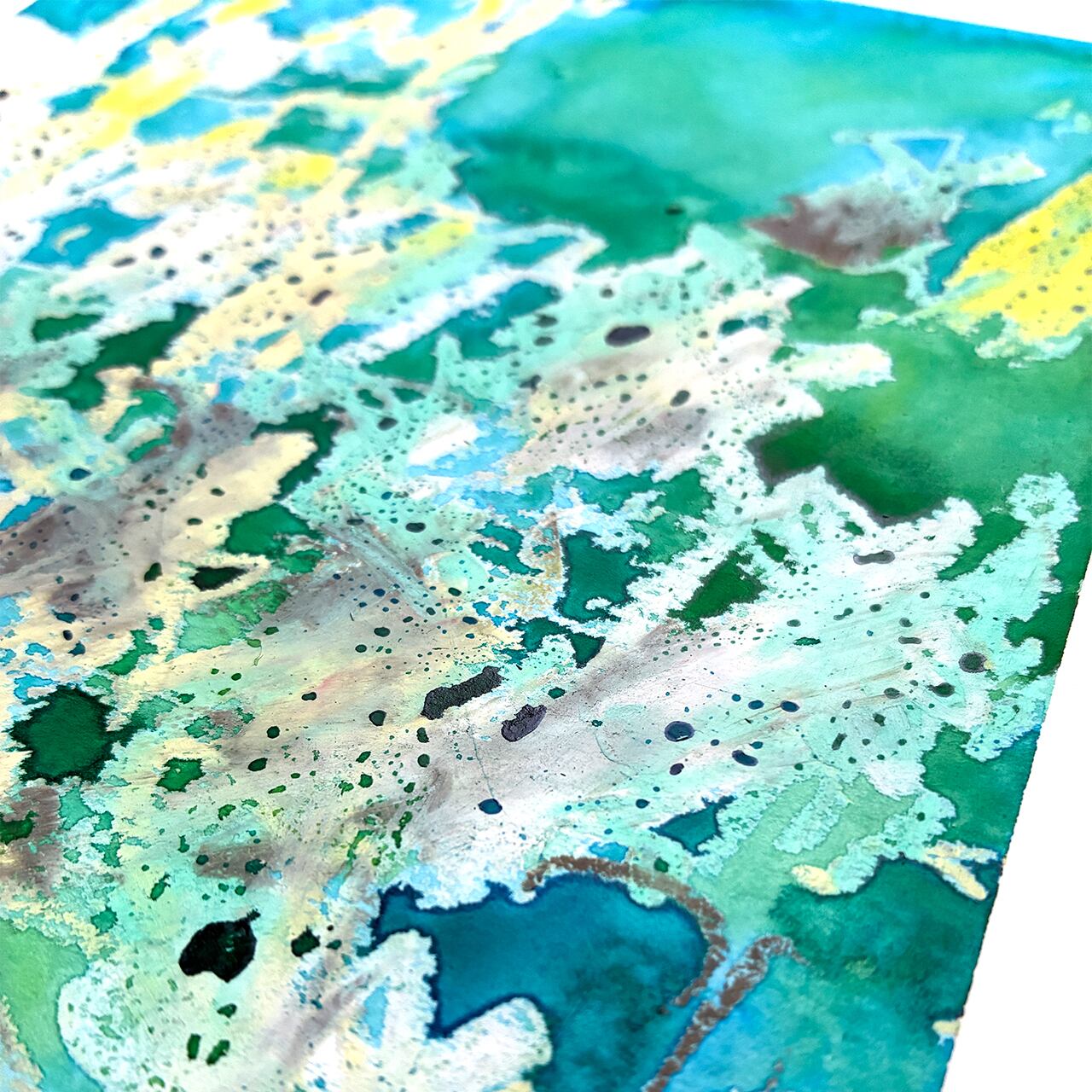 水彩紙に、水彩とオイルパステルで描かれた抽象画「ドローイング25」です。明るい色調とダイナミックなストロークが特徴です。用紙サイズは17cm×22cmです。
