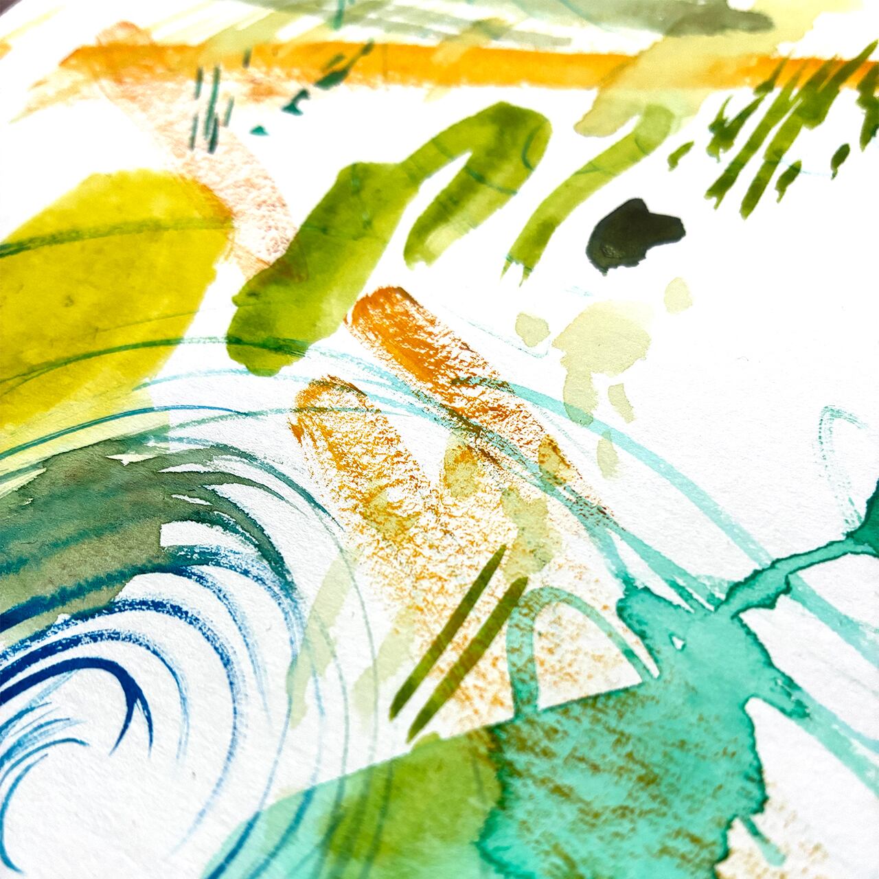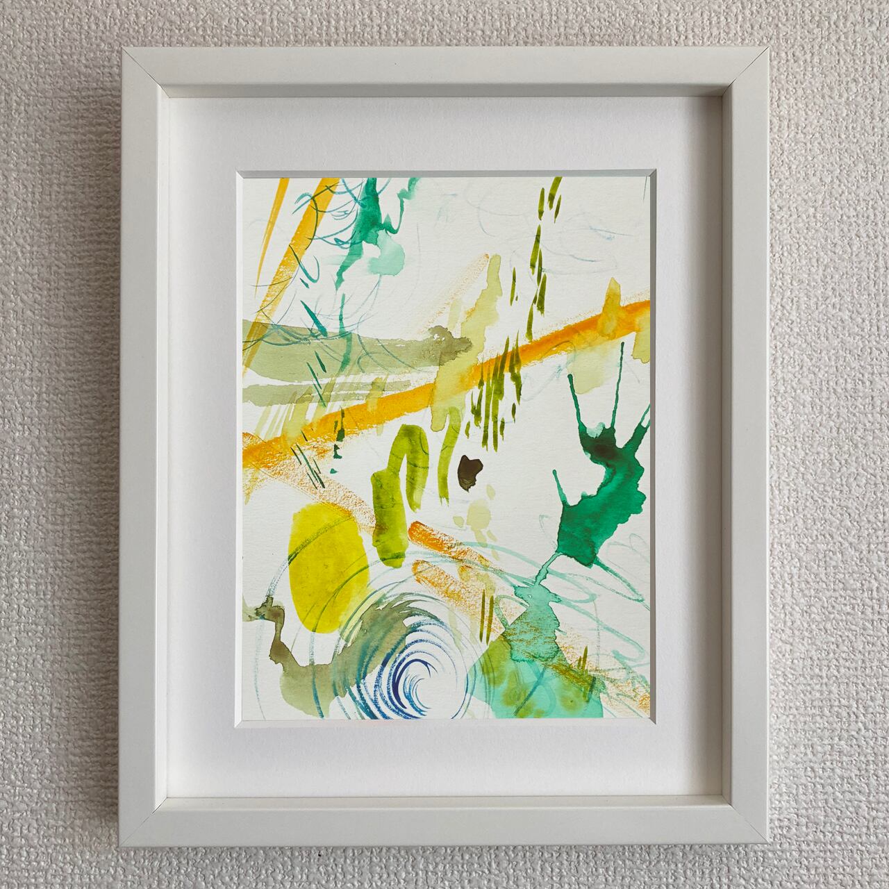 水彩紙に、アクリル絵の具で描かれた抽象画「ドローイング26」です。明るい色調とダイナミックなストロークが特徴です。用紙サイズは17cm×22cmです。